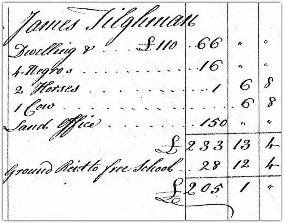 James Tilghman grew up at the Tilghman family estate on the eastern shore of Maryland before moving to Annapolis and later Philadelphia to pursue a law career. The family tobacco plantation, the Hermitage, was the residence of dozens of slaves living there in the late 18th-century, though no data exists for how many slaves were on the property during Tilghman’s youth. However, he continued to own slaves throughout his life.